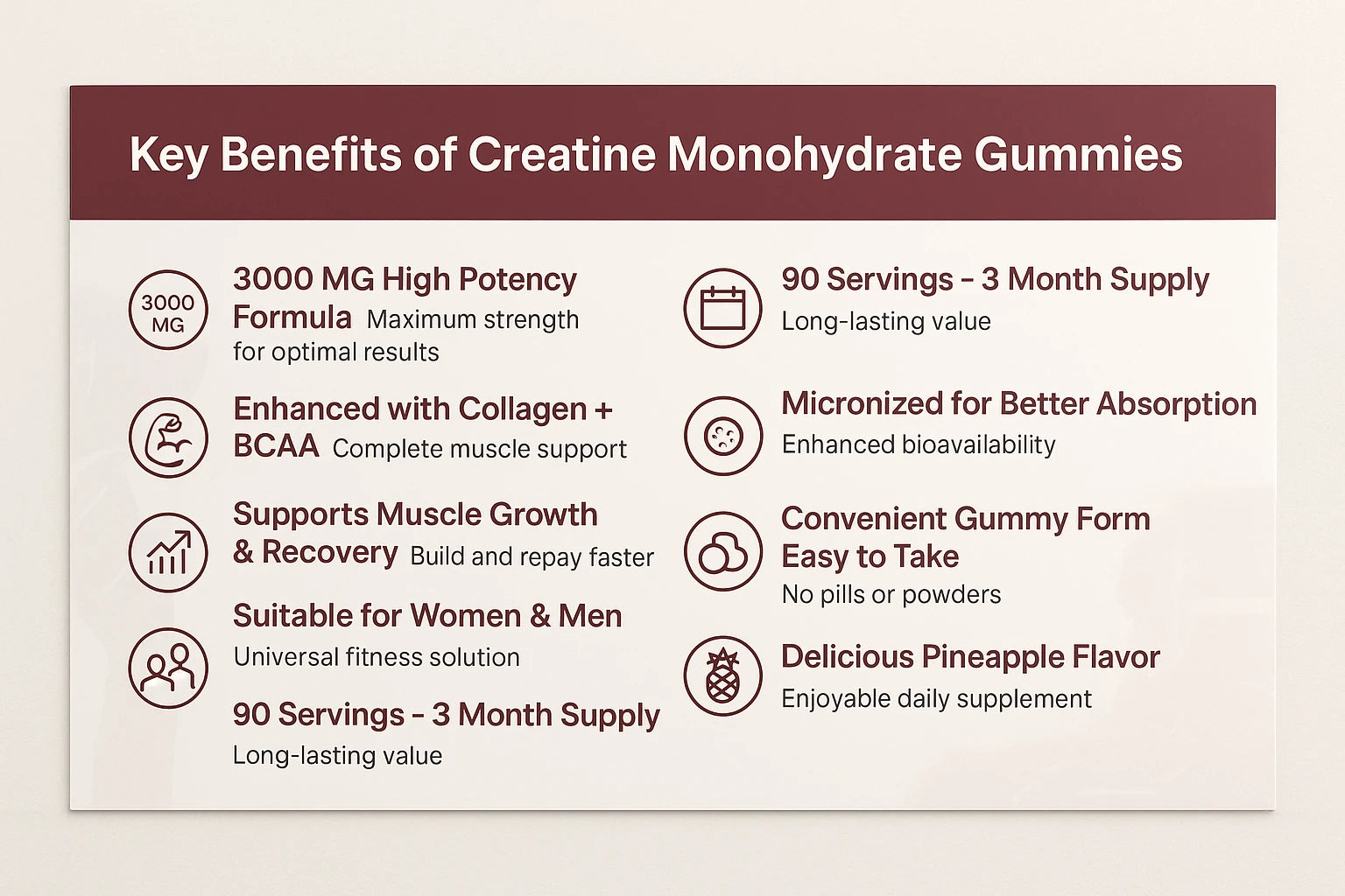 Answer 1: Creatine monohydrate gummies provide a convenient and enjoyable way to supplement your creatine intake. Unlike powders and tablets, they can be consumed without water and are easy to take on-the-go, making it simpler to maintain your routine. Additionally, these gummies are formulated for superior absorption, which may enhance their effectiveness in promoting muscle growth and improving athletic performance.
